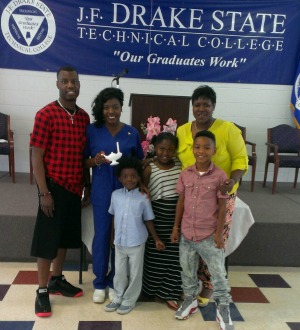 Tralushus had her first child as a young teen in Mississippi and another child at age 16. She had strong family support and graduated high school. It was during high school she decided she wanted to be a nurse. She started on her journey by first becoming a Certified Nursing Assistant (CNA) a year after she graduated high school. As a CNA, she worked with elderly patients. Her patients often requested her by name to care for them and she appreciated their many compliments. As a CNA, she worked under the supervision of a Licensed Practical Nurse (LPN). Tralushus later heard about the LPN program at J.F. Drake State. She applied in 2013, was accepted, and then moved to Alabama to start classes in January 2014. In 2013, she also married her husband. College was expensive despite financial aid. Her husband and mother were helping out with expenses. Tralushus applied for and was awarded an AOD scholarship in June 2014. She continued commuting from Decatur to classes in Huntsville and working two part-time jobs - one at a local book store and the other as a CNA on night shift. On the nights she worked as a CNA, she would end her shift at 6am, sleep in her car for a while, and then go to class. Her plan was to graduate in December 2014 but she failed a class in what should have been her final semester. Undeterred, she retook it and passed with a B. Similarly, in her final semester she did not make a passing score over 850 on her exit exam but on her second attempt a couple of weeks later, she passed it with a high score of 1,119 enabling her to graduate in May 2015. Getting through school was a tremendous challenge. Tralushus cried a lot and says she made a million mistakes but she knew God always loved her. She credits faith and prayer for getting her through school and says she could not have been successful without God. The AOD scholarship also funded Tralushus’ state license exam and background check. She again prayed and studied hard and passed on her first attempt. Tralushus moved back to Mississippi in June 2015 and was hired as a Licensed Practical Nurse at the Carrington Nursing Center in Starkville, Mississippi. Her job is full-time position with good pay and benefits. Tralushus loves her job and is enrolled in the Financial Peace University course. She plans on continuing her education to become a Nurse Practitioner. Tralushus hopes her story helps others maintain hope and achieve their goals.